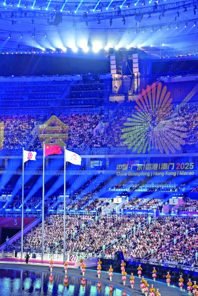 20时,开幕式准时开始。仪仗队员护拥五星红旗健步走入体育场,会旗方阵过后,各代表团依次入场。压轴入场的是广东体育代表团、香港体育代表团、澳门体育代表团,三地健儿同时入场宝牛配,体育场内掌声雷动,欢呼声响彻夜空。